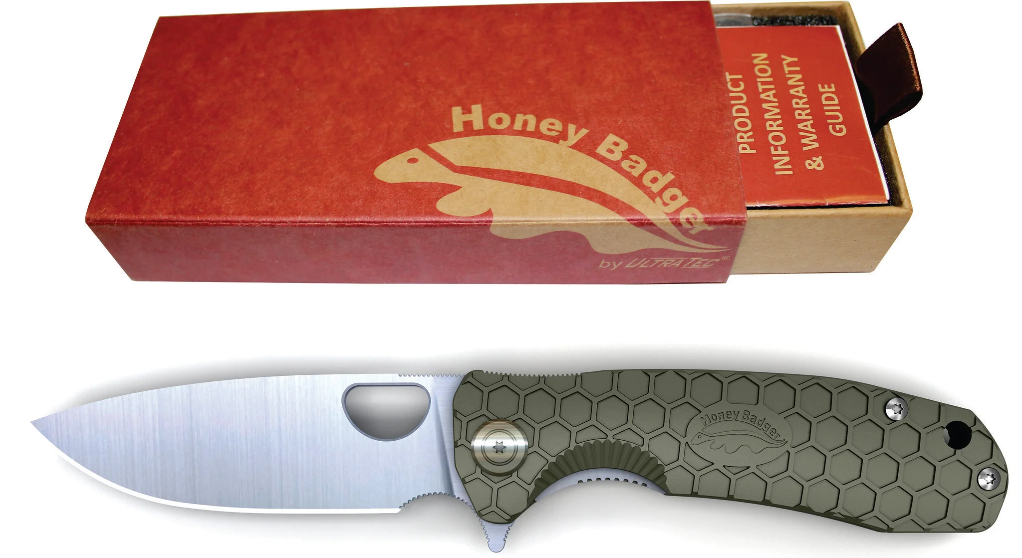The Honeybadger knives have a frictionless opening and closing action, facilitated by two opposing roller bearings containing a total of 18 ball bearings, very few knives ever achieve such an immaculate action, and makes using them a real pleasure to use a for camping, climbing, fishing and multipurpose around the house. Honey-Badger knives are superbly designed to be tough. " Honey comb pattern for multi-directional grip. " Light and Slim " Resistant to slipping even if wet " Fit ergonomically in the hand " 18 ball bearings for a smooth frictionless opening " 8Cr13MoV Stainless steel blade " Handle FRN (Fibre Reinforced Nylon)