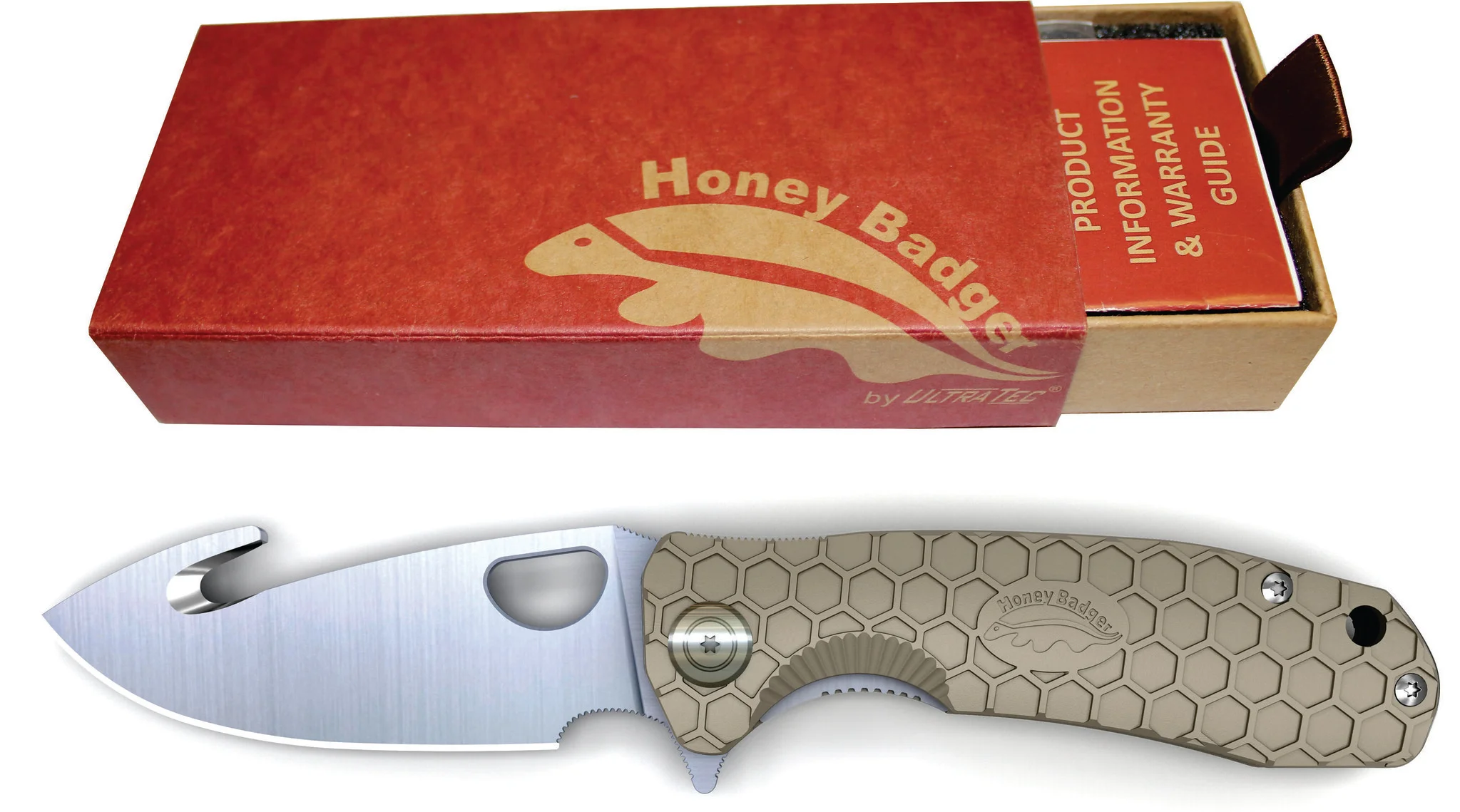 The Honeybadger knives have a frictionless opening and closing action, facilitated by two opposing roller bearings containing a total of 18 ball bearings, very few knives ever achieve such an immaculate action, and makes using them a real pleasure to use a for camping, climbing, fishing and multipurpose around the house. Honey-Badger knives are superbly designed to be tough. " Honey comb pattern for multi-directional grip. " Light and Slim " Resistant to slipping even if wet " Fit ergonomically in the hand " 18 ball bearings for a smooth frictionless opening " 8Cr13MoV Stainless steel blade " Handle FRN (Fibre Reinforced Nylon)