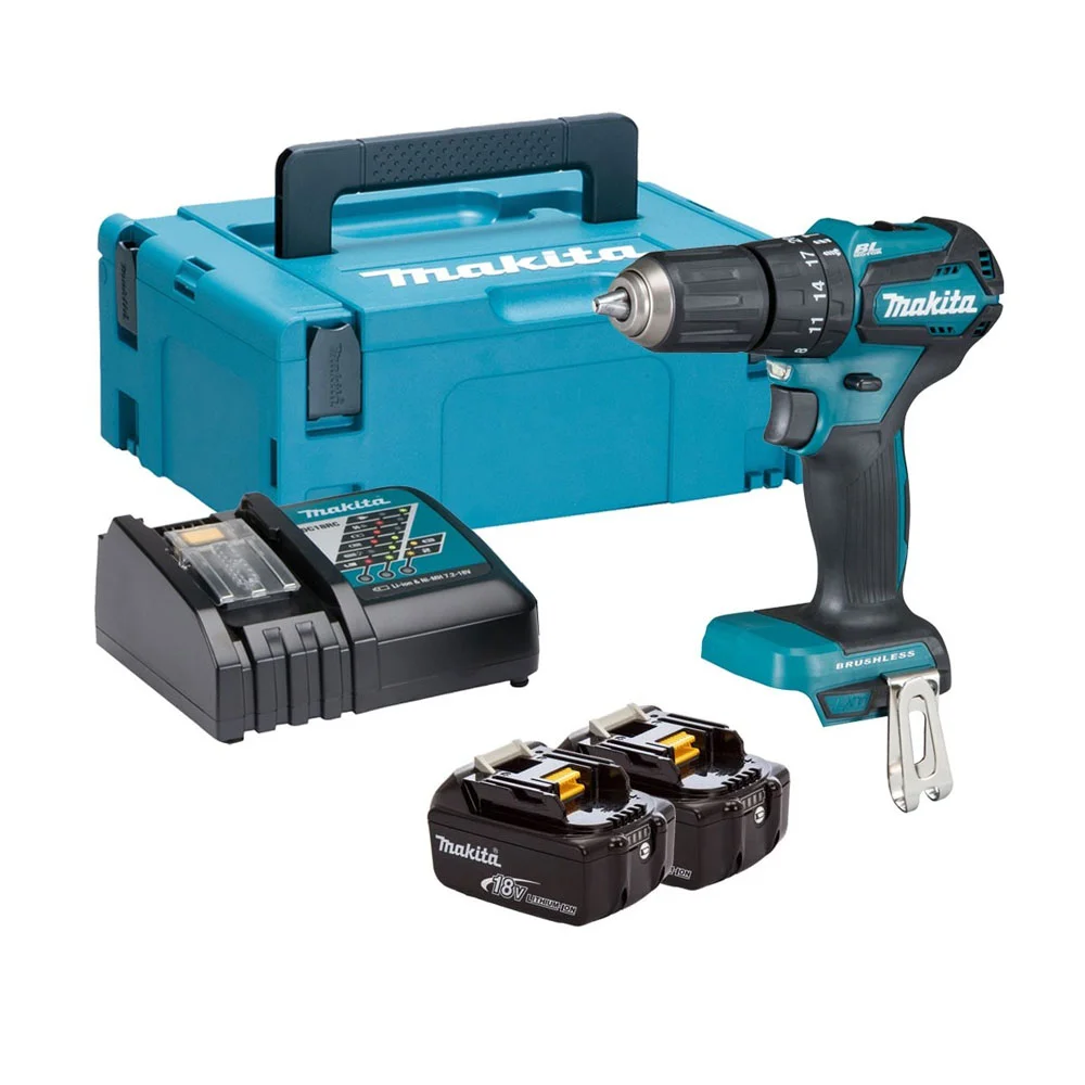 Brushless motor provides higher power and productivity Variable 2-speed for a wide range of drilling and fastening applications No load speed : High / Low: 0 - 1,700 / 0 - 500 Capacity : Steel / Wood / Masonry: 13 / 36 / 13 mm Max. fastening torque : Hard / Soft: 40 / 23 N?m Impacts per minute : High / Low: 0 - 25,500 / 0 - 7,500 Chuck capacity : 1.5 - 13 mm Standard Equipment : (+)(-) bit, Belt clip Includes 2 Batteries (3Ah) / 1 Charger / Makpac Connector Case